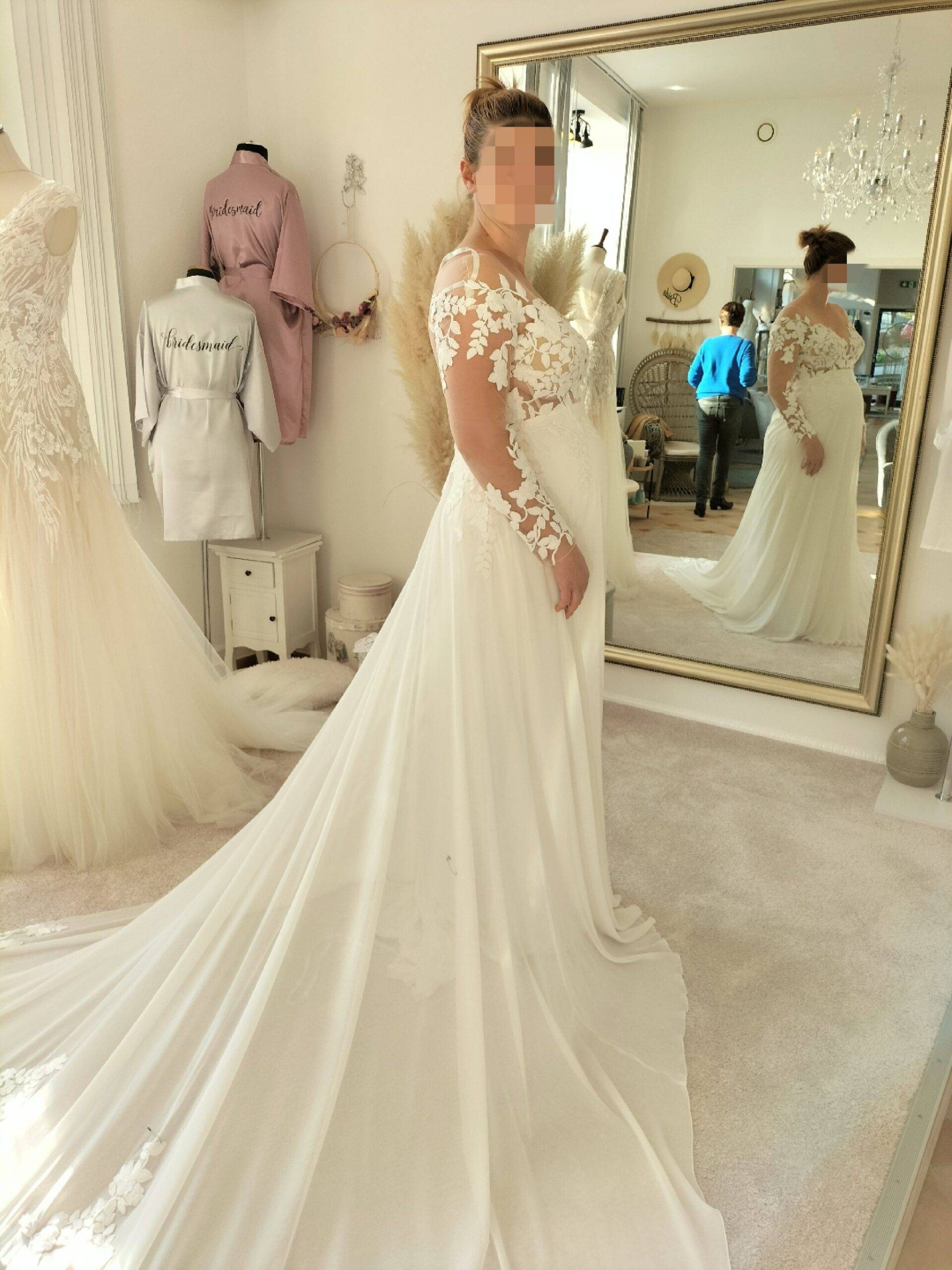 Forme Ausschnitt, Rücken, Ärmel neu; ergänze Spitze, Gürtel, Cups, Illusions-Tüll. Harmonisch abgestimmt auf Figur, Kleidstil, dein Hochzeitskonzept, mit Feingefühl heute.